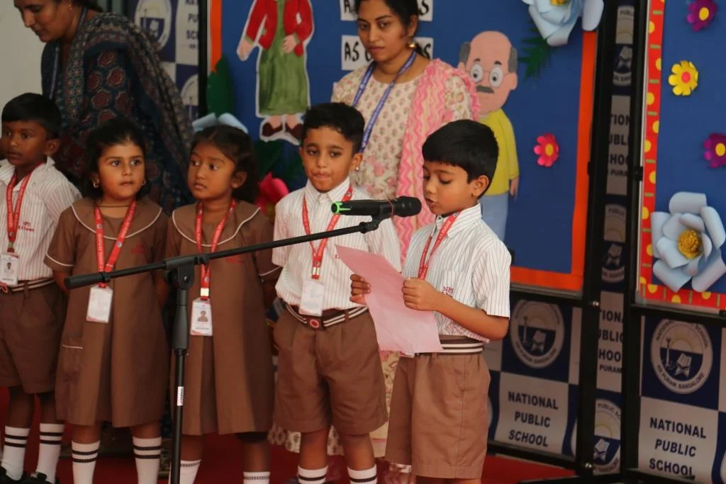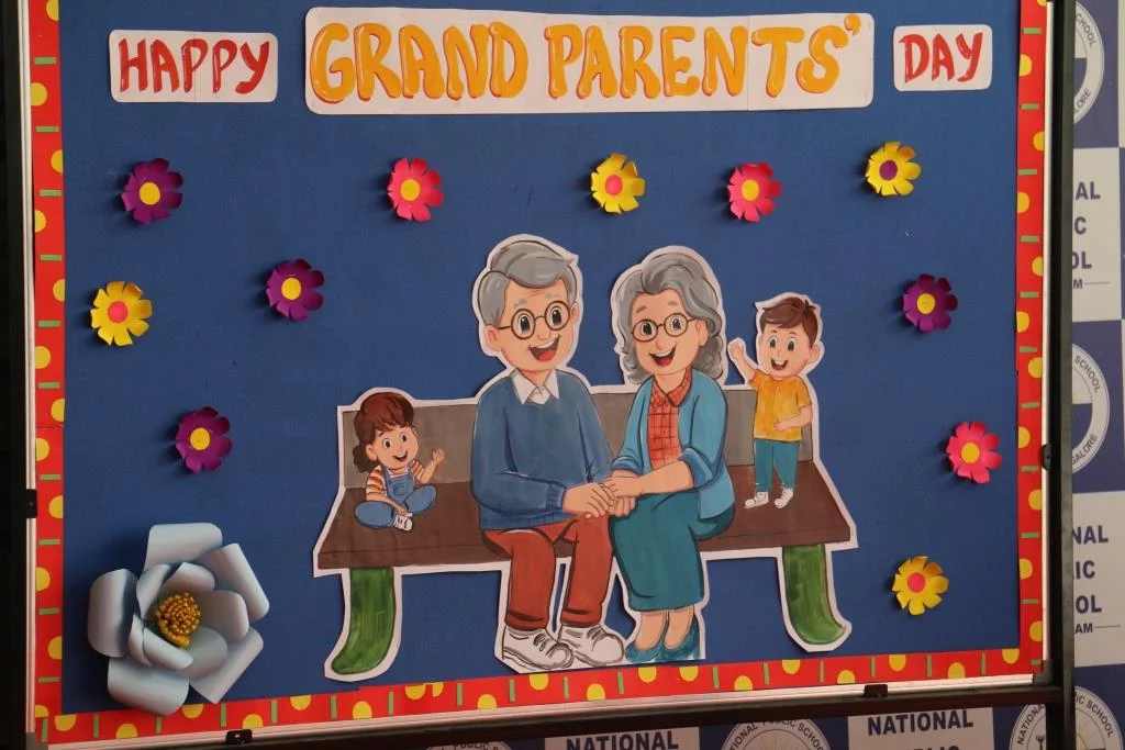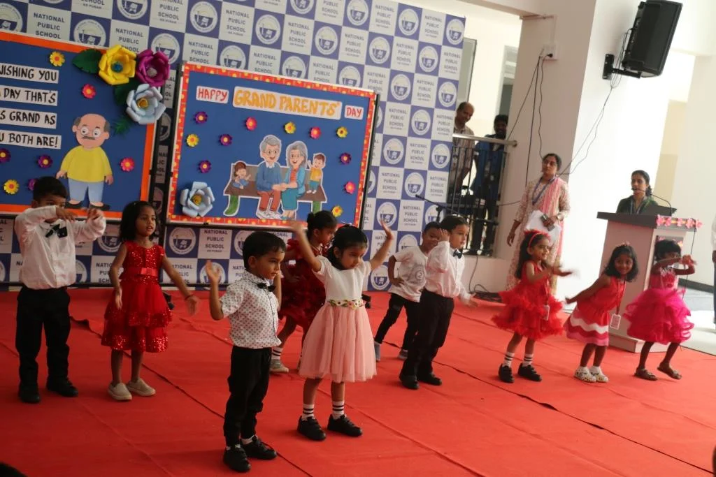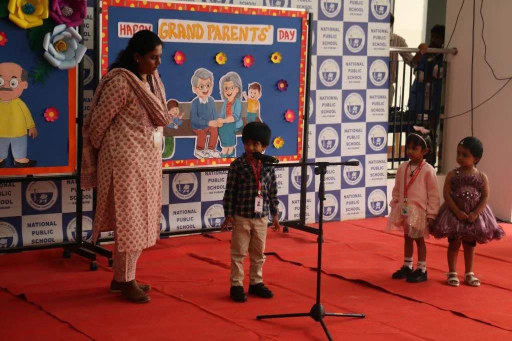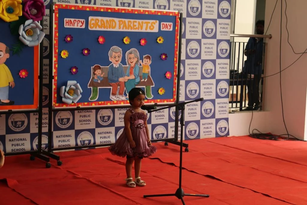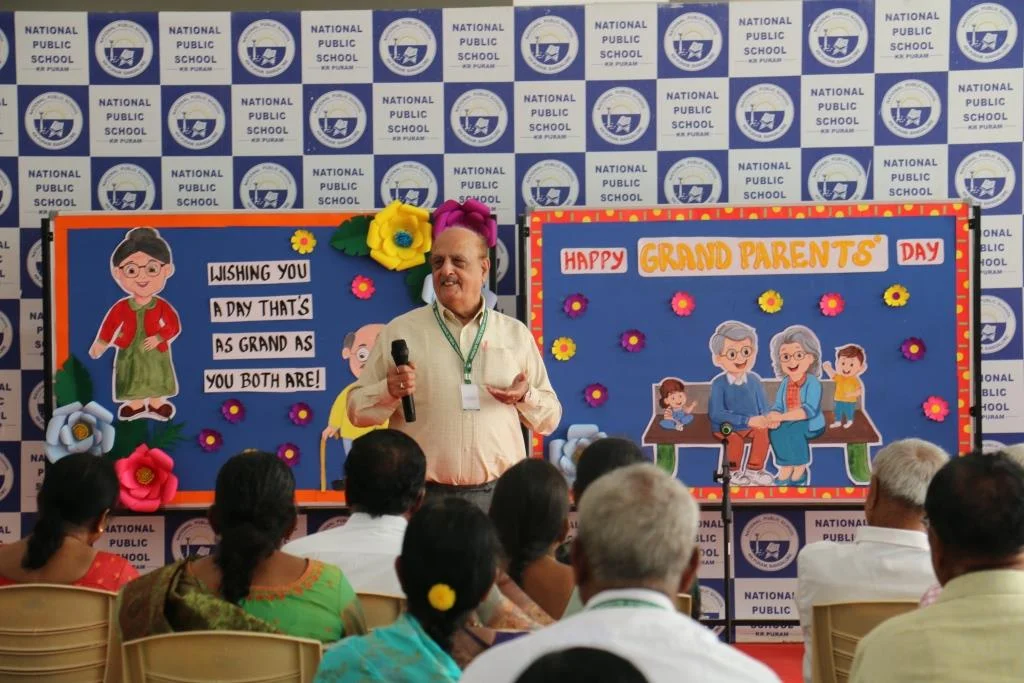 On 8th September 2025, NPS KR Puram celebrated Grandparents Day with much joy and enthusiasm. The program began with children singing Slokas and performing dances, followed by a warm welcome from Nursery and LKG students. UKG children conducted a fun puppet quiz, and grandparents actively participated in entertaining games. The event concluded with grandparents sharing their appreciation for the teachers, making it a memorable day of love and togetherness.